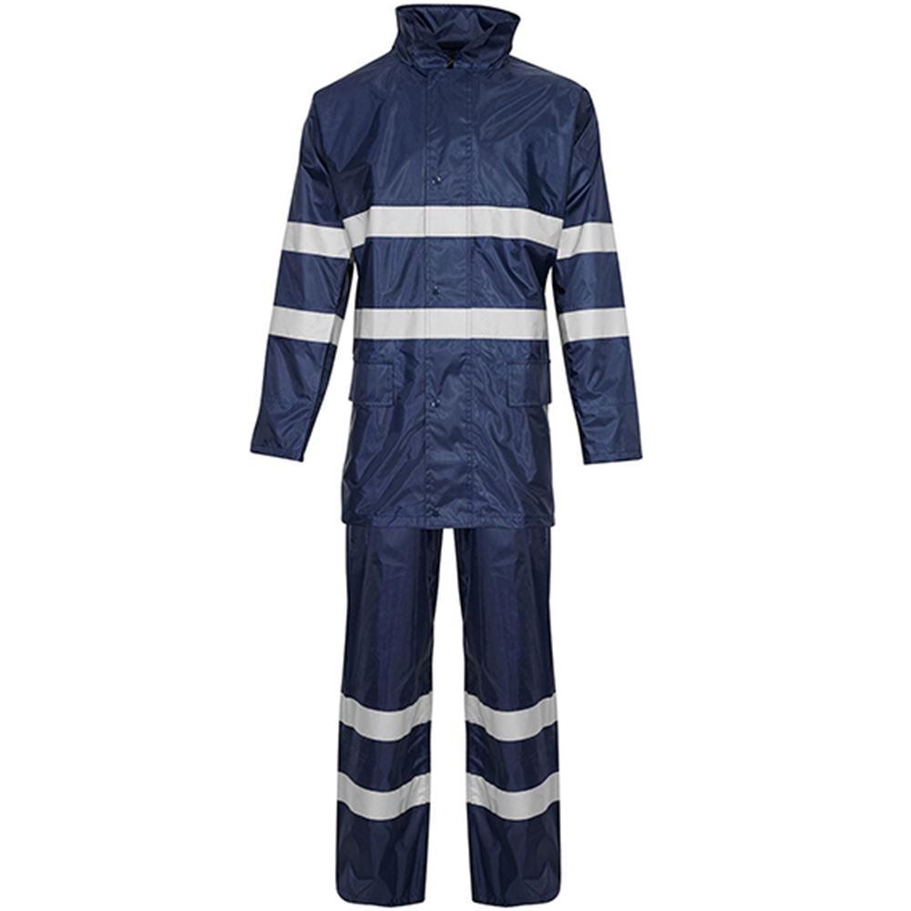 - Durable two-piece polyester PVC navy hi vis rainsuit with jacket and over trousers